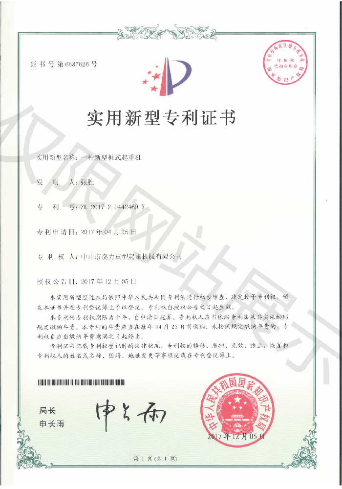 實用新型專利證書 -- 柱式起重機